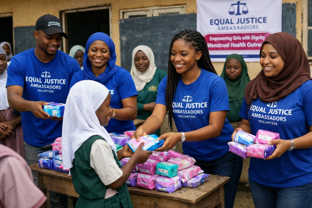 Equal Justice Ambassadors Volunteers conducted a menstrual health outreach programme in Nigerian schools aimed at supporting adolescent girls with access to essential sanitary products. The initiative focused on promoting dignity, health awareness, and equal educational opportunities for female students.